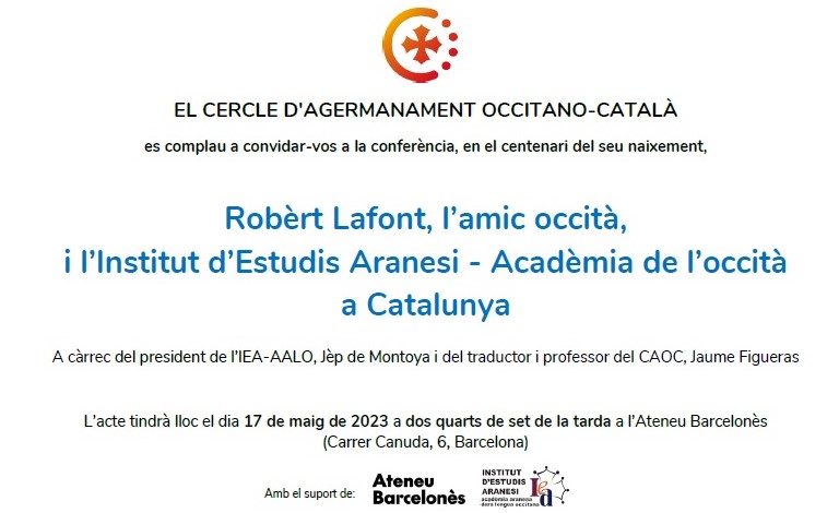 Amb motiu dels cent anys del naixement de Robèrt Lafont, abordarem els molts contactes que tot al llarg de més de mig segle mantingué amb els catalans, des que el 1950 visità els homes de l’IEC fins a la celebració de l’Eurocrongrés 2000, així com la seva relació amb l’Aran, a cavall entre Occitània i Catalunya – fet que ens permetrà de conèixer l’activitat i els projectes de l’Institut d’Estudis Aranesi – Acadèmia de l’occità a Catalunya.