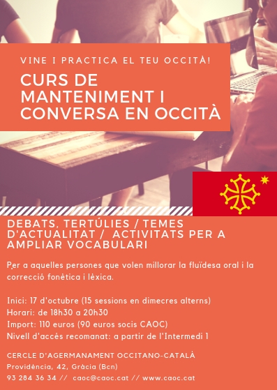 Enguany i com a novetat s’incia un Curs de Manteniment i Conversa en occità, per a aquelles persones que volen millorar la fluïdesa oral i la correcció fonètica i lèxica. Les sessions es faran en dimecres alterns i començaran el dimecres 17 d’octubre. Programa.