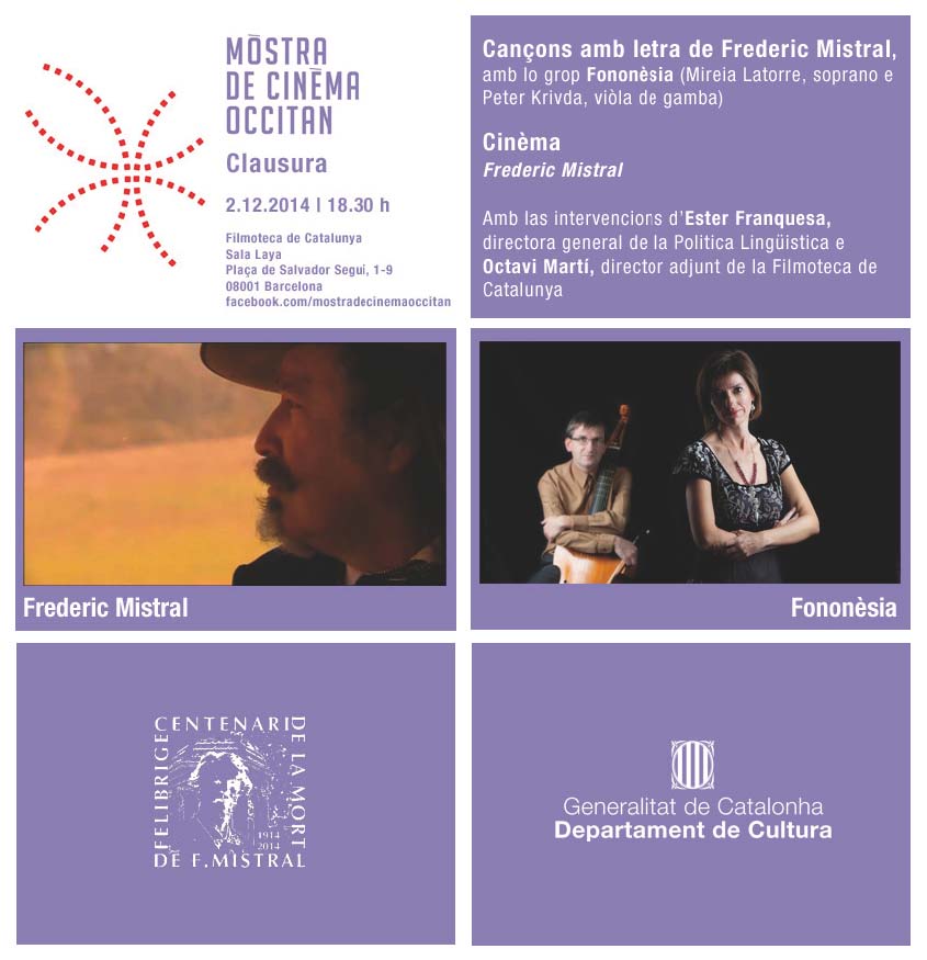 El proper dimarts 2 de desembre tindrà lloc a la Filmoteca de Catalunya l’acte de Clausura de la Mòstra de Cinèma occitan 2014, amb la projecció de la pel·lícula “Frederic Mistral”. Durant l’acte, recital de cançons amb lletra de Frederic Mistral del grup Fononèsia (Mireia Latorre, soprano i Peter Krivda, viola de gamba), i intervencions d’Ester Franquesa, directora general de Política Lingüística i Octavi Martí, director adjunt de la Filmoteca de Catalunya.