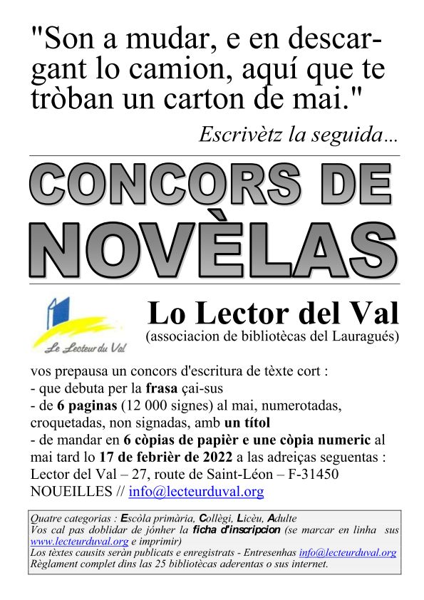 Las bibliotècas del Lector del Val (associacion de bibliotècas de Lauragués / sud-èst tolosan) organizan lor XXIVen concors de novèlas (qu’es lo Xen en occitan), dobèrt a totes e a gratís, fins al 17 de febrièr de 2022.