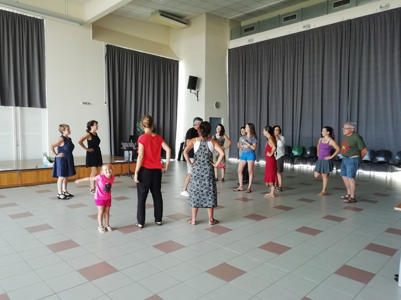 Aprèp manjar, de 2 a 3 oras del miègjorn, un desenat de personas participan al talhièr de dansas occitanas. Uèi quitament una pichona catalana de l’escoleta, Iris, i participa tanben. Dansa plan, e totes s’amusan plan! Acaban en preparar una cançon, una dansa amb de padenas, per a la serada dels estagiaris.