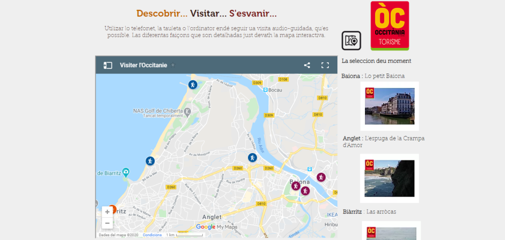 Perqué ne pas descobrir Occitània, en occitan, o visitar endrets, apréner l’istòria e la lenga occitana, en VO, o a còp en francés preus curiós. Perqué esperar après la mesa en plaça d’accion publicas quan la societat civila la pòt devançar e motivar las soas accions ? Perqué esperar la fin de l’acantonament ? O perqué esperar après guides oficiaus qui ne son pas briga interessats per la lenga e la cultura occitanas ? D’ara enlà, mercés a la plata-fòrma (la mapa de las visitas disponiblas sul site), que serà possible de conéisher e d’utilizar, a distància o sus plaça, dens la lenga de l’endret, visitas audioguidadas…