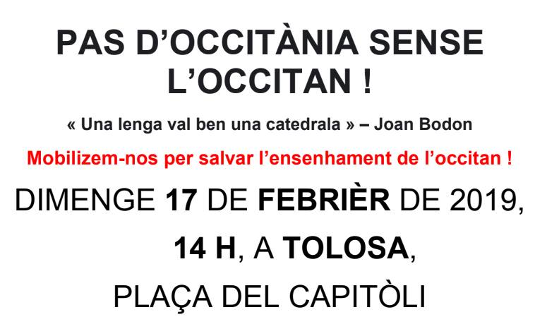La manifestació en defensa de l’ensenyament en occità, prevista per al proper diumenge 17 de febrer a Tolosa de Llenguadoc, és la resposta que prepara la societat civil occitana davant les amenaces del govern francès. Els organitzadors de la marxa són el Centre Regional dels Ensenhaires d’Occitan (CRÈO Tolosa) amb la col·laboració de la FÈLCO i la Calandreta.
