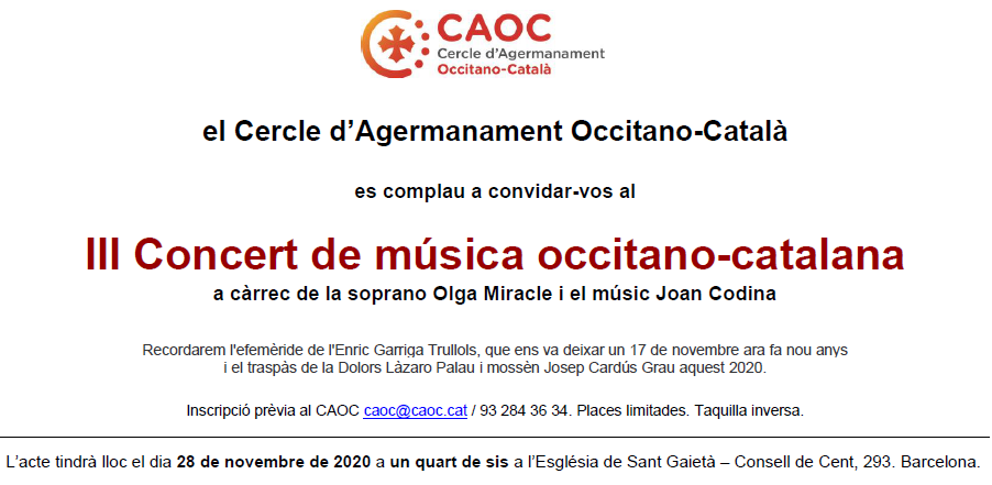 El Cercle d’Agermanament Occitano-Català, celebarà el dissabte 28 de novembre, a l’Església de Sant Gaietà, la tercera edició del concert de cançó occitano-catalana a càrrec de la soprano Olga Miracle i el músic Joan Codina Vila.