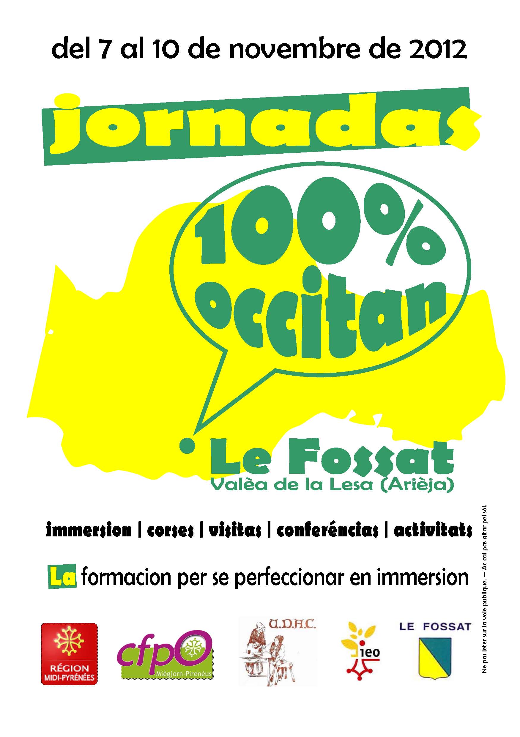 Las jornadas 100% occitan 2012 se tengueràn al Fossat (Valèa de la Lesa, Arièja) del 7 al 10 de novembre. Una formacion de perfeccionament de 4 jorns.