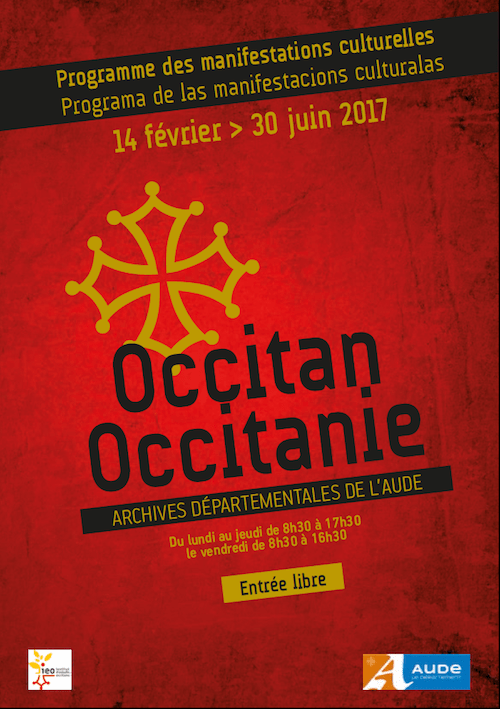 La mòstra « Occitan, Occitania » serà presentada dins los locals dels Archius d’Aude fins al 30 de junh de 2017 (dobèrta al public del diluns al dijòus de 8h30 a 17h30 e lo divendres de 8h30 a 16h30).