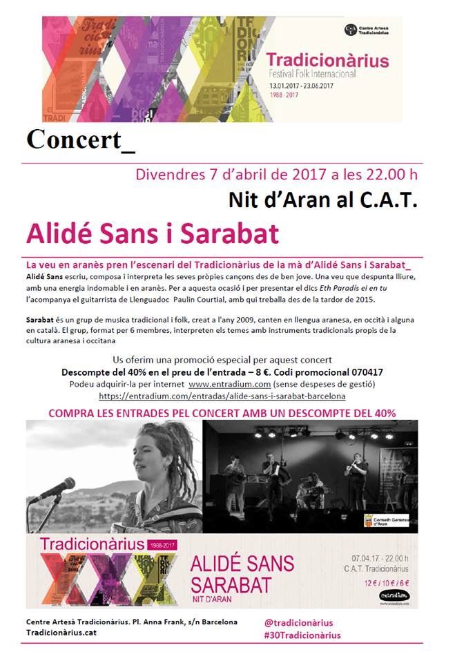 El divendres 7 d’abril, a les 22.00 h , tindrà lloc al Centre Artesà Tradicionàrius la Nit d’Aran amb la cantant Alidé Sans i el grup Sarabat.