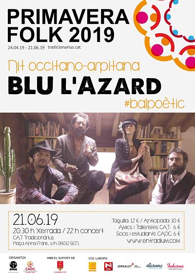 El Cercle d’Agermanament Occitano Català i el Centre Artesà Tradicionàrius organitzem una vetllada de concert i ball occitano-arpitana amb el grup BLU l’Azard, nascuts l’any 2013 com a projecte artístic per a la difusió de les llengües minoritàries al Piemont i la seva cultura. Recerca, tradició, composició i improvisació és el que caracteritza aquest grup.