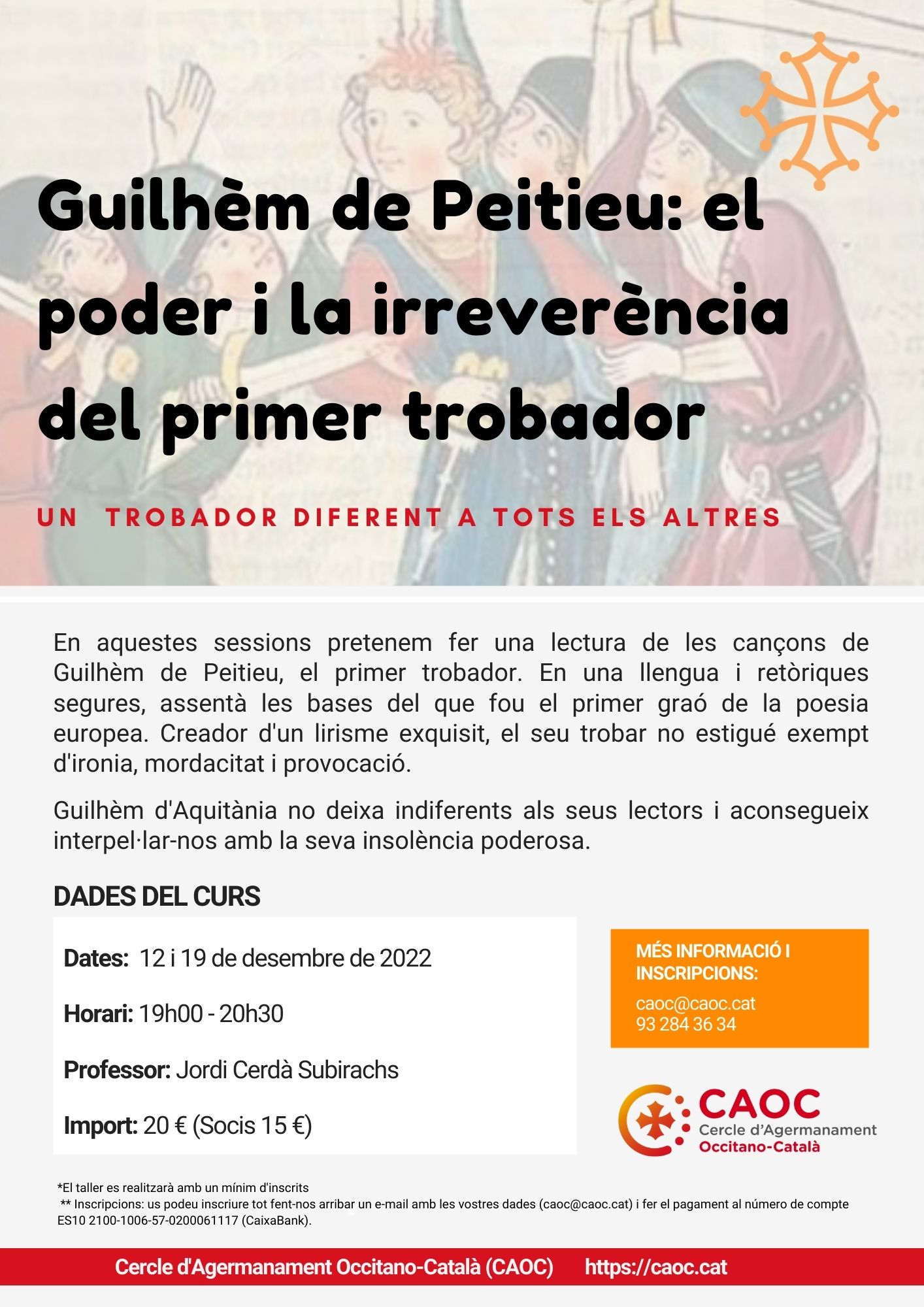 En aquestes sessions pretenem fer una lectura de les cançons de Guilhèm de Peitieu, el primer trobador. En una llengua i retòriques segures, assentà les bases del que fou el primer graó de la poesia europea. Creador d’un lirisme exquisit, el seu trobar no estigué exempt d’ironia, mordacitat i provocació.