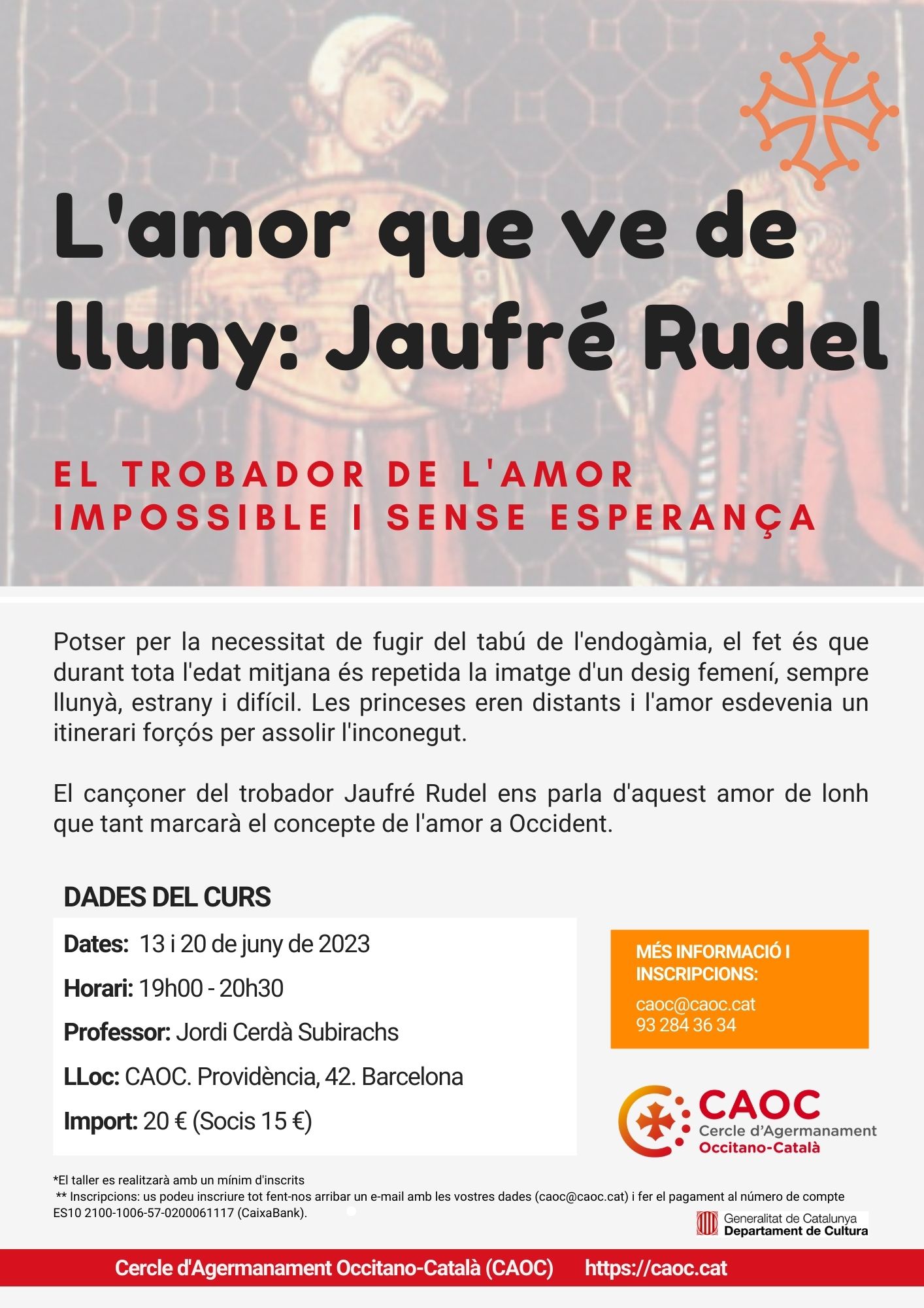 Dues sessions per acostar-nos a Jaufré Rudel, el trobador que va viure al segle XII, i que es va enamorar de la comtessa de Trípoli sense haver-la vist mai, només per les excel·lències que n’havia sentit dir.