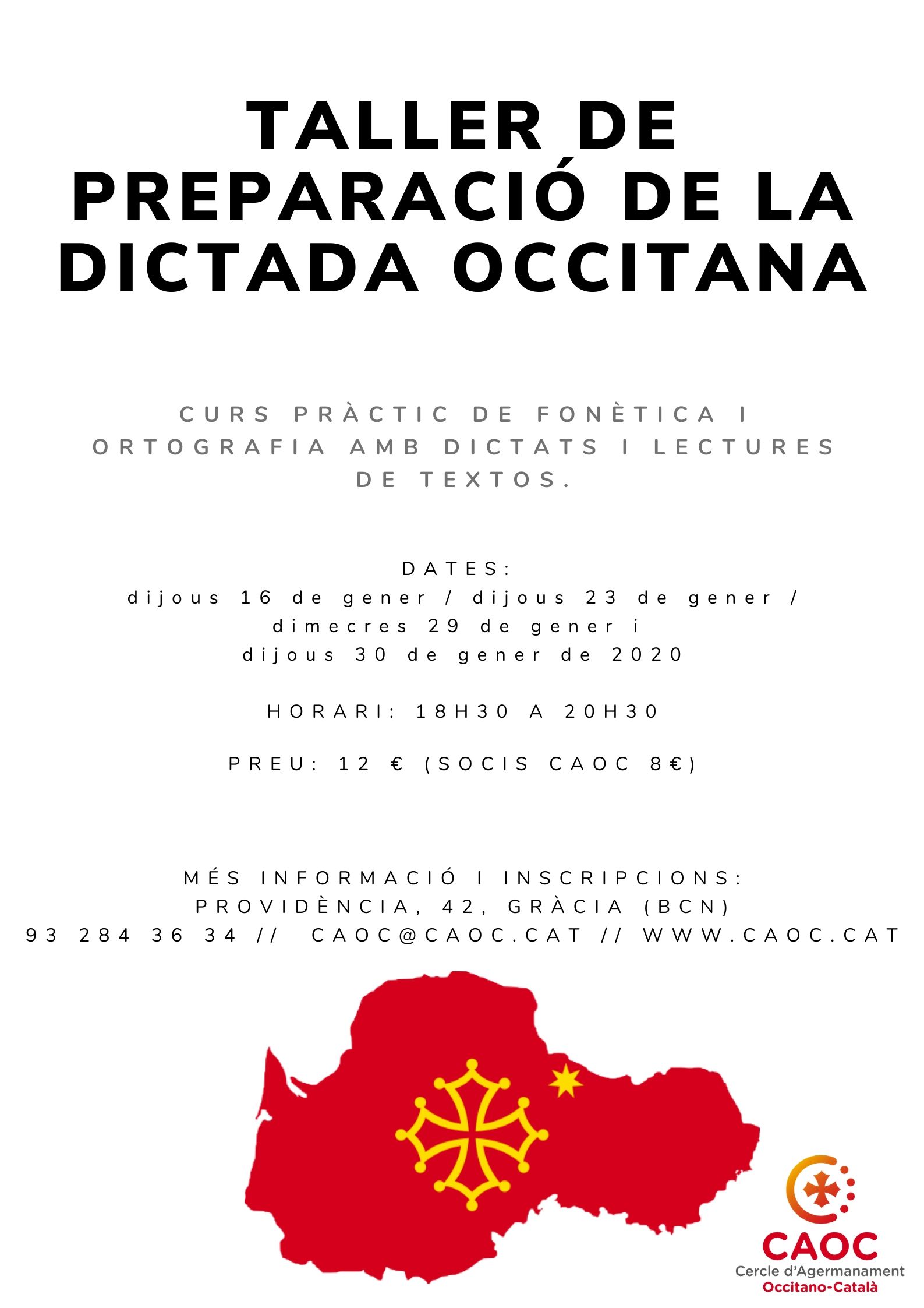 Properament iniciarem un curs de 4 sessions, del 16 al 30 de gener, d’introducció a l’occità que també servirà per aquells que vulguin preparar-se per participar a la Dictada Occitana que enguany se celebrarà simultàniament el dissabte 1 de febrer a Barcelona i a d’altres 43 poblacions occitanes.