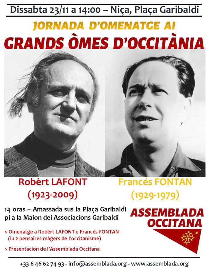 - 14:00 — Dichas e tesmoniatges en omenatge a Robèrt Lafont e Francés Fontan, Plaça Garibaldi, près de l’estatua de Garibaldi.