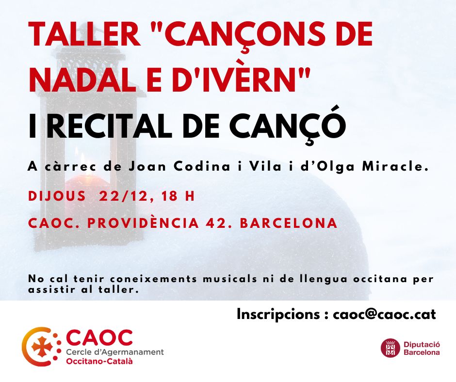 – 18h00 – 19h30: Taller “CANÇONS D’IVÈRN E DE NADAL”. A càrrec del professor Joan Codina i Vila, amb la preparació vocal a càrrec de l’Olga Miracle.